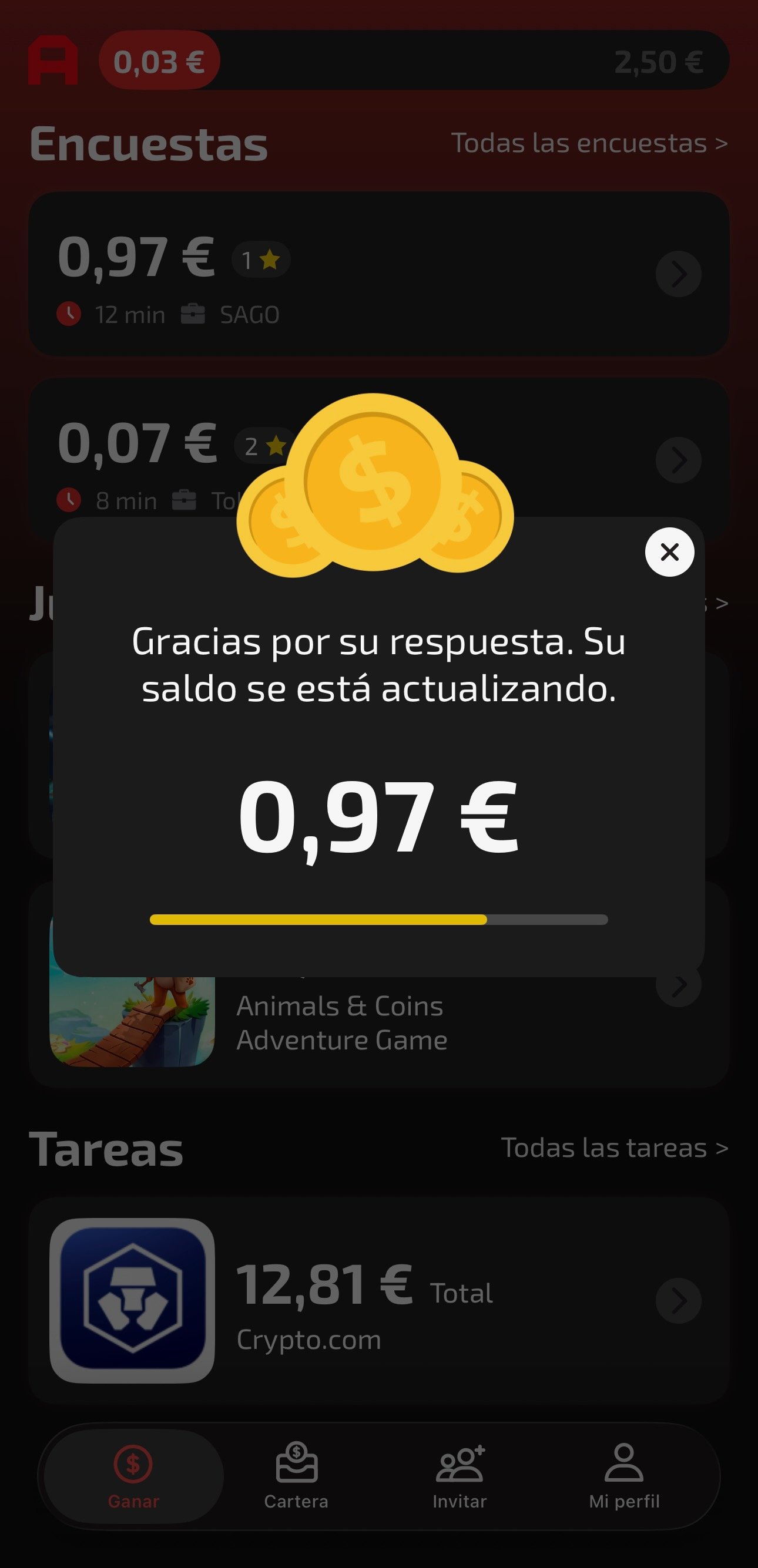 • Tareas variadas: Pequeñas acciones rápidas que suman céntimos constantemente a tu saldo.